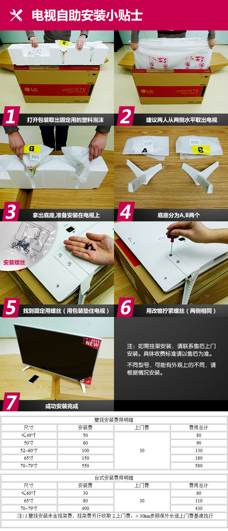 安装备注:如顾客使用的是非LG售后所提供的挂架,在顾客自愿与LG售后签订协议后,可以给予安装。 |