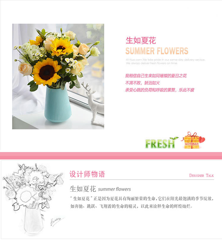 • 生如夏花--向日葵3枝、香槟玫瑰9枝、白色小雏菊