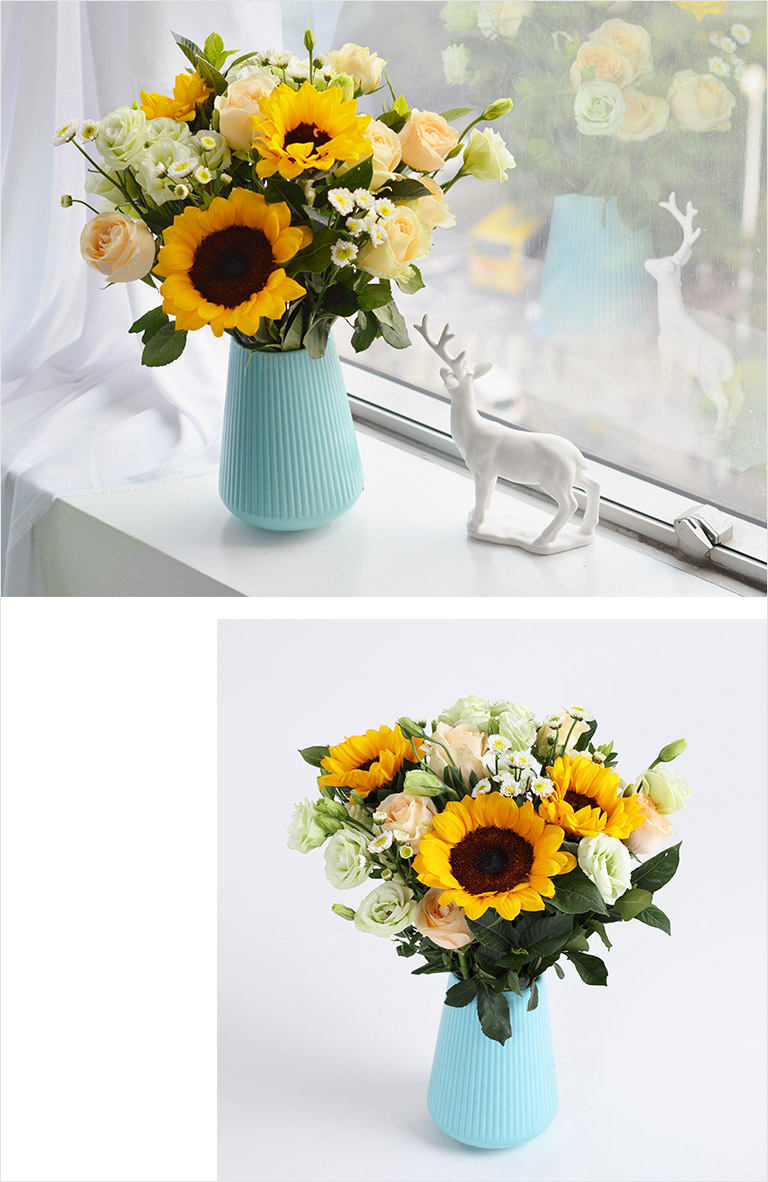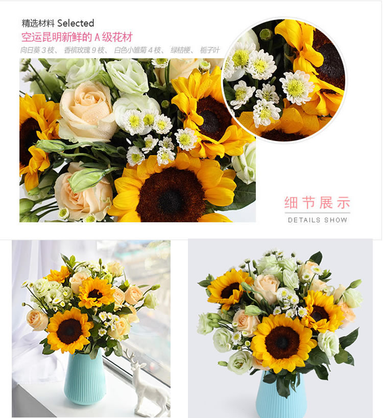 • 向日葵3枝、香槟玫瑰9枝、白色小雏菊4枝、绿桔梗5枝、栀子叶4枝。