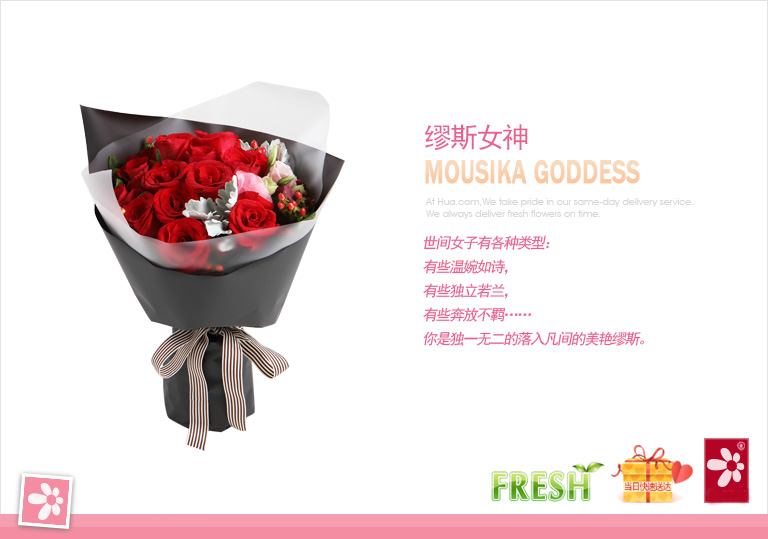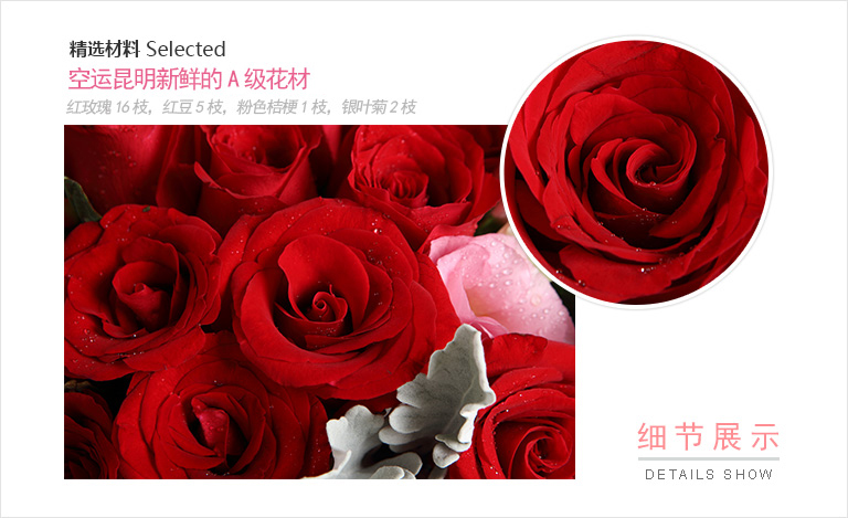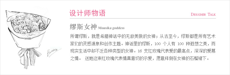 • 缪斯女神--红玫瑰16枝,红豆5枝,粉色桔梗1枝,银叶菊2枝 女神专属 美艳缪斯