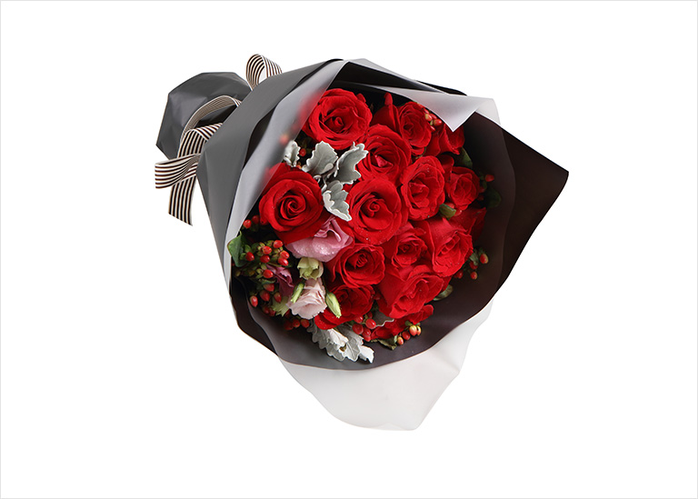 缪斯女神--红玫瑰16枝,红豆5枝,粉色桔梗1枝,银叶菊2枝 女神专属 美艳缪斯
