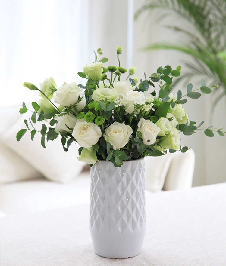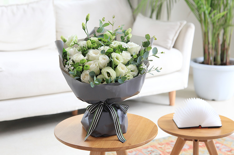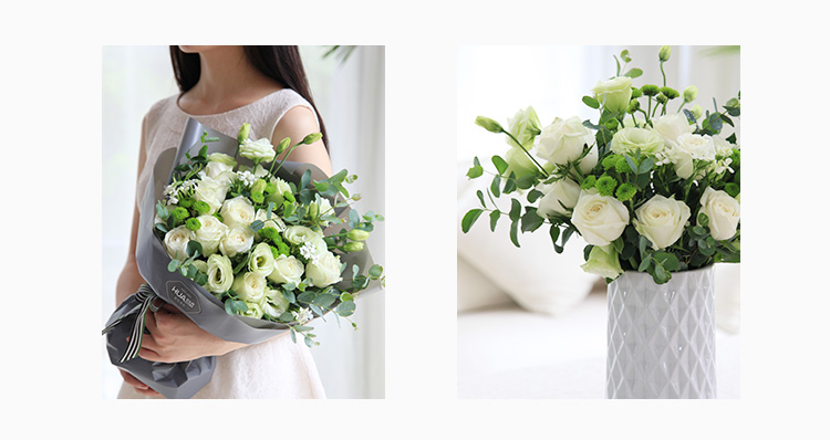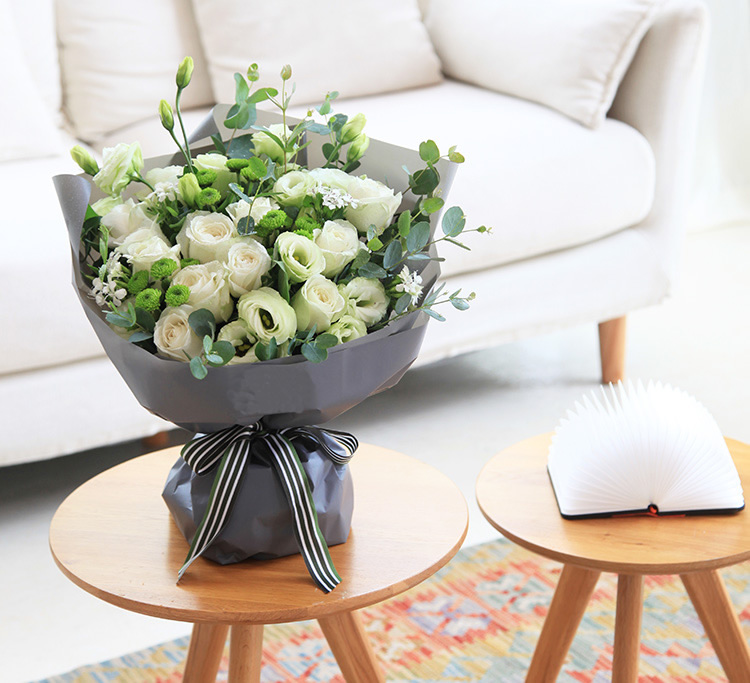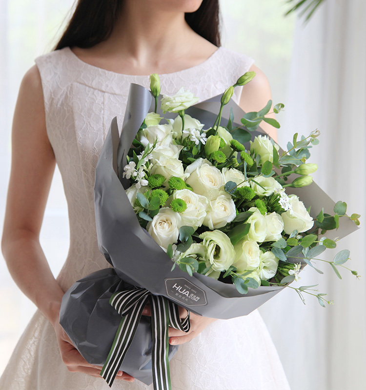 • 月光女神--白玫瑰11枝,绿色桔梗5枝,小菊3枝,白色石竹梅4枝 小清新设计 清新无比
