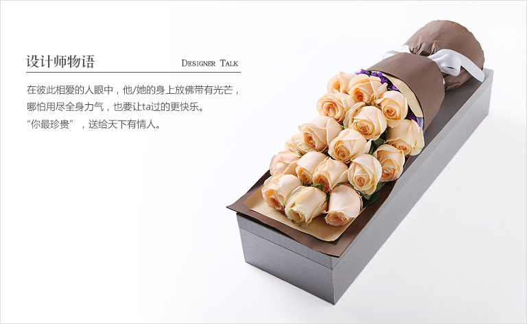 • 你最珍贵--精品玫瑰礼盒:香槟玫瑰19枝,勿忘我适量 优雅设计 精致甄选