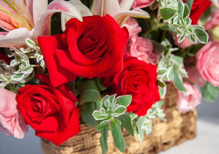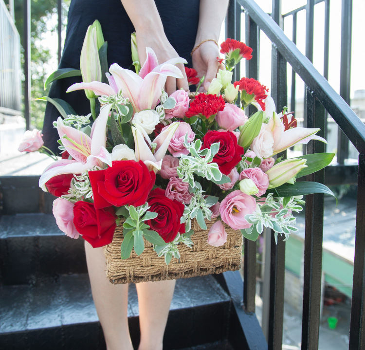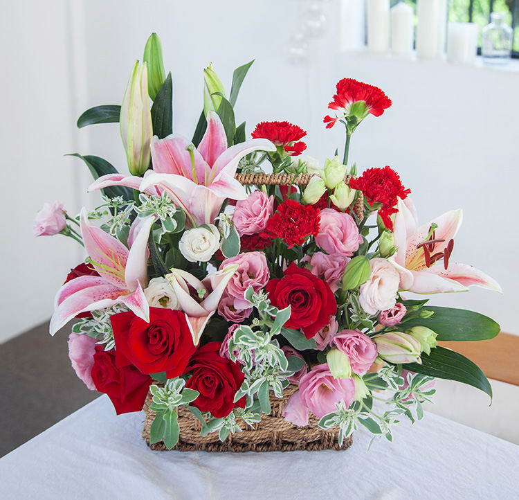 • 圆满--粉百合2枝、红玫瑰9枝、红色康乃馨15枝